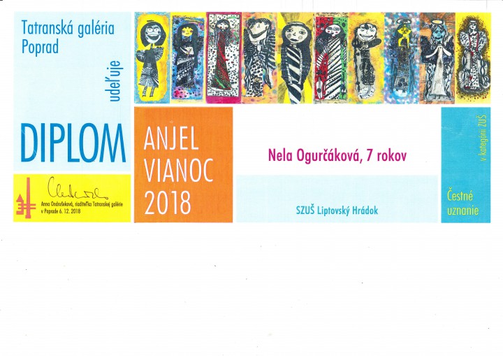 V Tatranskej galérii v Poprade sa v dňoch od 6. 12. 2018 - 31. 1. 2019 konala tradičná výstava detskej výtvarnej tvorby ANJEL VIANOC 2018, na ktorej boli vystavené aj výtvarné diela našich žiakov. Ako škola zároveň gratulujeme Nelke Ogurčákovej, ktorá na tejto výstave získala za svoje výtvarné dielo diplom a čestné uznanie v kategórii ZUŠ. Ďakujeme našim žiakom za skvelú reprezentáciu výtvarného odboru a našej školy.