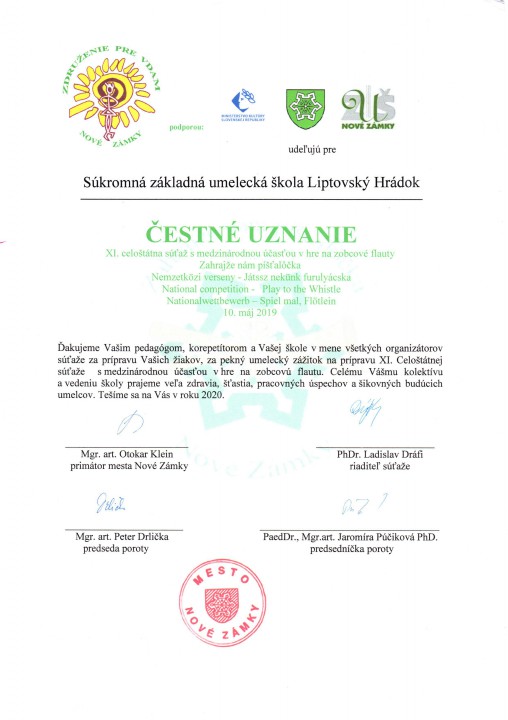V piatok 10. 5. 2019 sa Jakub Lupták s pedagógom PaedDr. Ivanom Mrázom, PhD. zúčastnili celoštátnej súťaže s medzinárodnou účasťou v hre na zobcovej flaute "Zahrajže nám píšťalôčka".